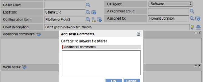 The example I’ll use here is based on one that a ServiceNow developer wrote as an example. It’s not very fancy, but it’s simple enough to show how things work without adding a bunch of confusing elements. It simply opens a dialog with information populated from the form and returns information from the dialog to the form.