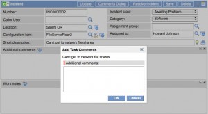 Once you have your UI Action set up to trigger the dialog, you need to make sure that you have the correctly-named UI Page to display in the dialog. In the script above, we used ‘var dialog = new GlideDialogWindow(“task_comments_dialog”);’ to initialize a GlideDialogWindow and point to the ‘task_comments_dialog’ UI Page. Here’s what that page looks like. The comments in the HTML below explain each piece of the UI Page. The client script portion of the UI Page is used to validate the input on submission of the dialog form. If validation passes, the value of the ‘Comments’ field on the dialog is passed to the ‘Comments’ field on the original form.