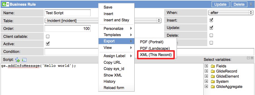Service-now.com makes extensive use of the XML format for storing and transporting system updates and changes. Update sets, System Import Sets, and certain export methods all make use of XML files in one way or another. One feature that a lot of people don’t know about until somebody shows them is the ability to export and import XML files in a Service-now instance. A manual XML import/export can be extremely helpful in the right circumstances and is something that every Service-now consultant or administrator should have in their tool belt. In this post, I’ll explain how simple it is to transport system changes from one Service-now instance to another with a few clicks.