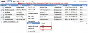 You can also export to XML from any full table list (it doesn’t work from related lists on a form). Exporting from a list allows you to filter down to multiple records (or even a single record) that you want to export. Anything that shows in the filtered list will be part of the export. The export option is accessed by right-clicking the list header as shown below.