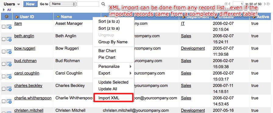 Once you have an XML export using one of the methods described above, you can import that XML file into any Service-now instance by right-clicking any full list header (it doesn’t work from related lists on a form) and selecting the ‘Import XML’ option. Since your XML file contains all of the details about the record(s) included you don’t have to worry about where you initiate the import from. For example, I could import a business rule export using the context menu from a list of users. The system knows from the details of the XML file where the records really need to go. It also doesn’t care if the import contains one or multiple records. The process is the same for both. Any record(s) that don’t exist in the destination instance will be created and any that already exist will be updated – AS LONG AS THE SYS_ID VALUES MATCH.