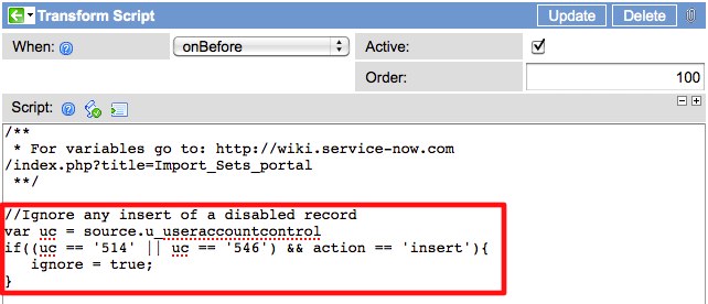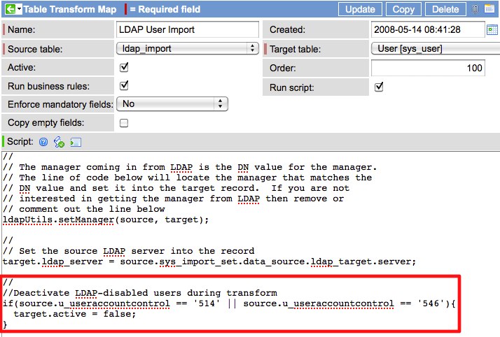1Separate import process from LDAP just for disabled users: In this approach you don’t attempt to handle disabled users through the standard LDAP import at all. Instead, you (or your LDAP Admin) produce a separate extract from your LDAP source that contains the users that need to be disabled. This extract can then be used in a separate import to simply set the ‘active’ flag on every record in the import to ‘false’. The entire script (‘target.active=false’) can be placed in the ‘Script’ field directly on the ‘Table Transform Map’ record.