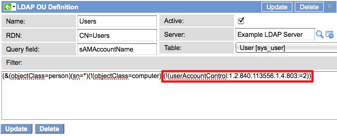 2Open up the LDAP OU filter to bring everything in to your import set table (including disabled users) and then ignore inserts of disabled users based on certain script conditions: The sample ‘Users’ OU definition that ServiceNow provides in its out-of-box LDAP sample contains a filter that looks like this…