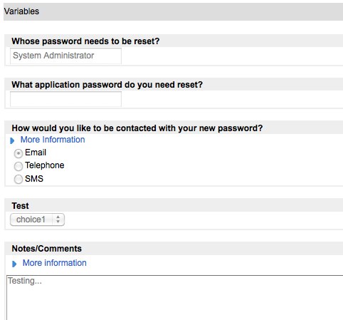 The other option is to simply not show the variables at all and instead dump them into the work notes or comments fields. Here’s a script I found on the forums that takes all of the variables for a given item and sends them to the work notes field on that same item.