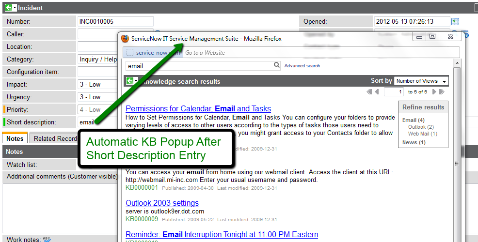As the user keys in the Short Description, a client script calls a script include that searches the knowledge base in the background and outputs the results back to the client script. The client script then displays search results inside a UI formatter that we placed just below the Short Description field.