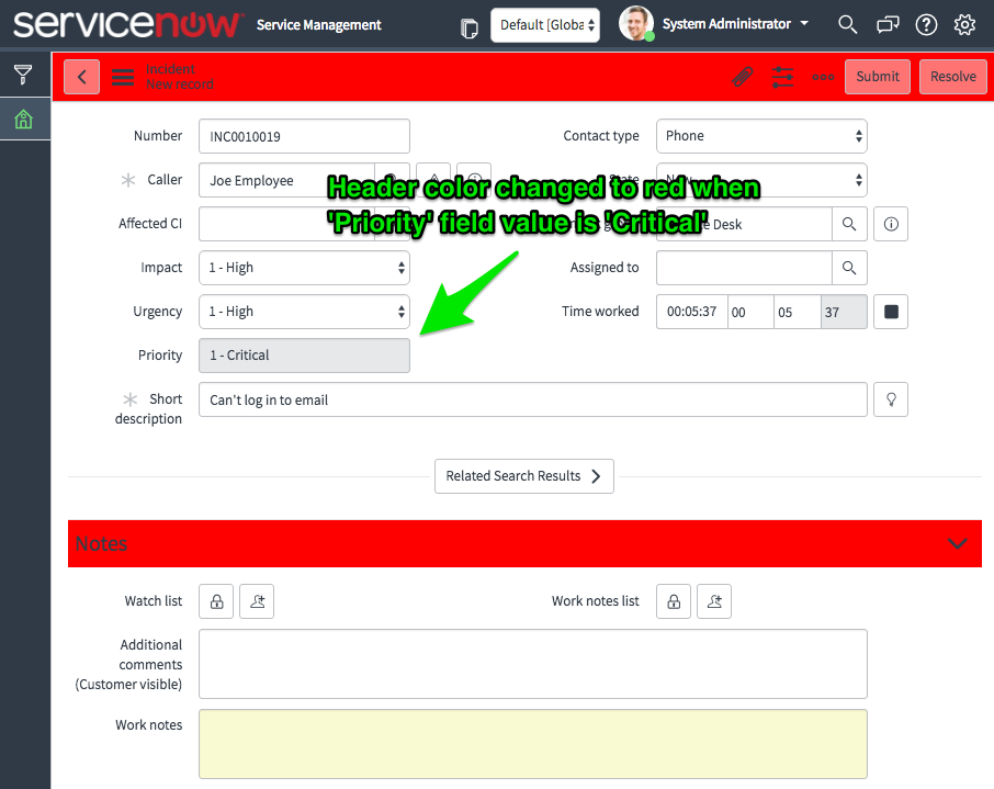 This request required something more dynamic so that the color could change based on specific table and record values and specific changes to a specific form. In order to accomplish this, I came up with a simple client script that can be used anywhere you need it.