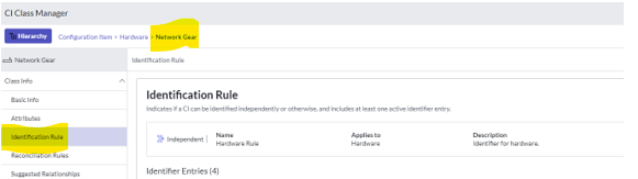 - Go to ‘CI class manager’. Search for any CI class that you want to check (e.g., Network Gear) and open it. Click on the ‘Identification Rule’ tab.