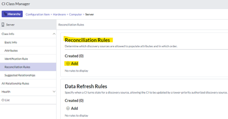 Note: Multiple reconciliation rules can be created for the same CI class to define discovery sources and their priorities for various attributes that are populated in the CI class.