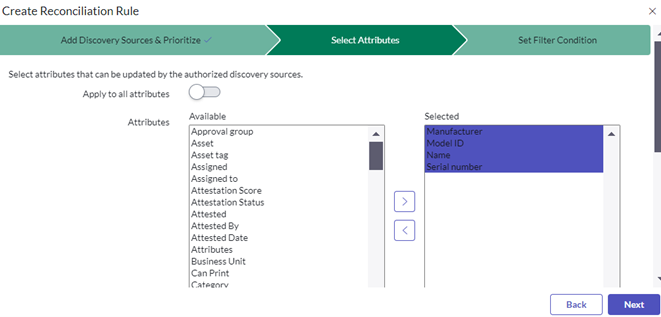 Step 2: From the ‘Select Attributes’ tab, choose the attributes for which this rule will be applicable. The ‘Apply to all attributes’ option can be enabled if we need to use the rule for all attributes of that class. As per the attributes selected in the following screenshot, manual entry will not be able to overwrite the data from ServiceNow Discovery for Manufacturer, Model ID, Name, and Serial Number.