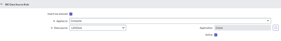 Consider a scenario in which a certain data source is no longer trusted to create new CIs in a particular class, but it can be trusted to update existing CIs only. IRE data source rules can be created to prevent a specific data source from inserting new CIs for a specific class. For example, the following rule indicates that insert is not allowed from the LANDesk data source to the Computer CI class.