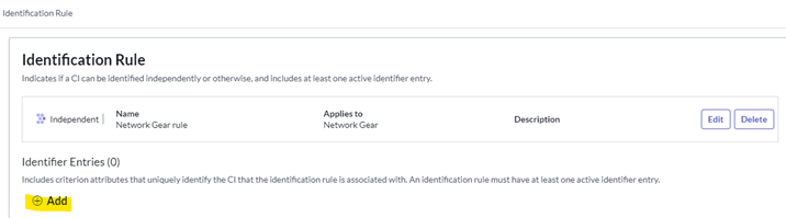 Let’s take the ‘Network Gear’ class as an example. Open ‘CI class manager’ from the application navigator. Search for Network Gear. Click on ‘Identification Rule’ tab. The ‘Identifier entries’ section shows the list of attributes which are specified as the identifier entries for this class.