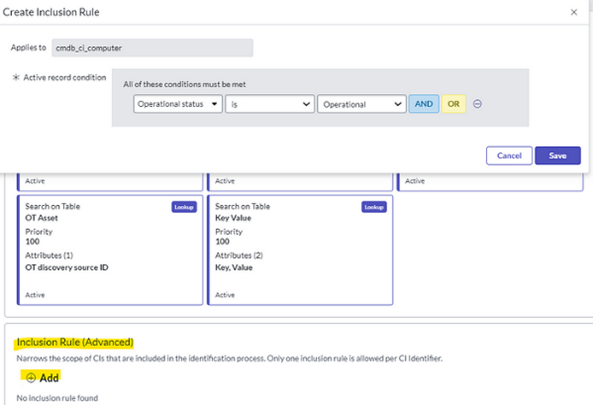 Identification inclusion rules can be accessed and configured by going to the ‘Inclusion Rule (Advanced)’ section present under the Identifier entries defined in the ‘Identification Rule’ tab of a CI class. Click on ‘Add’ and then define the ‘Active record condition’. For example, the following screenshot shows how to set an inclusion rule for the ‘Computer’ CI class with the condition Operation status=Operational.