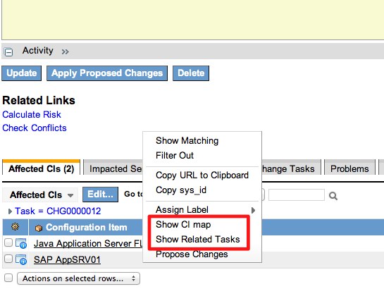 The ability to associate Affected Configuration Items against a task is one of the most basic pieces of the various task forms in ServiceNow. ServiceNow gives you the ‘Configuration Item’ field to associate a single CI and the ‘Affected CIs’ related list in the event that your task needs to be associated to multiple CIs. I’ve written before about the benefits of tracking all of this information in one place to simplify reporting and usage requirements. During an onsite visit with a customer this week I noticed another opportunity to improve the functionality of the ‘Affected CIs’ related list. It would be very useful to be able to right-click items in the ‘Affected CIs’ related list and show a BSM Map or associated tasks just like you can do for the ‘Configuration Item’ field UI Macro icons. This post will show you how you can set these list context UI Actions up in your instances.