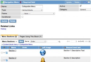 The first step is to set up your menus. The only important part of this step for this solution is to make sure your menu is a VERTICAL BLOCKS menu. Other than that, simply create the menu, add sections and items below it, and include any icons you want to use. If you want to have a page with a 2-column menu setup, you’ll need to create a separate menu for each column.