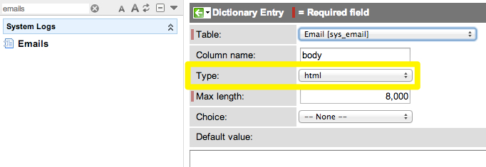 The solution here is actually very simple…if you know where to look. As an ‘admin’ user, simply navigate to ‘System Logs – Emails’ and open an email log form. Once there, right-click the ‘Body’ field and select ‘Personalize – Dictionary’. Finally, change the field ‘Type’ value to ‘html’ and update the dictionary record.