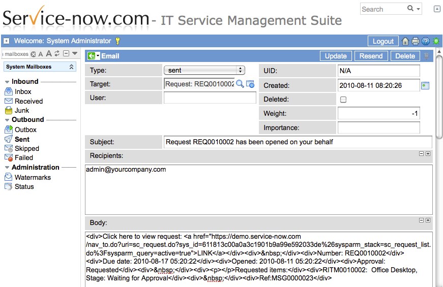 Here’s a cool tip that was just sent to me by my friend Jim Coyne. We collaborated to solve a problem that he had in his environment and this post shows the result he came up with. This post shows how you can manipulate records in the email log (sys_email table) when you have a need to change the contents or recipients of an email record. Manipulating the outbound email logs isn’t something that should be relied upon heavily and I would consider it basically a last resort but it can prove very helpful in solving the right type of problem.