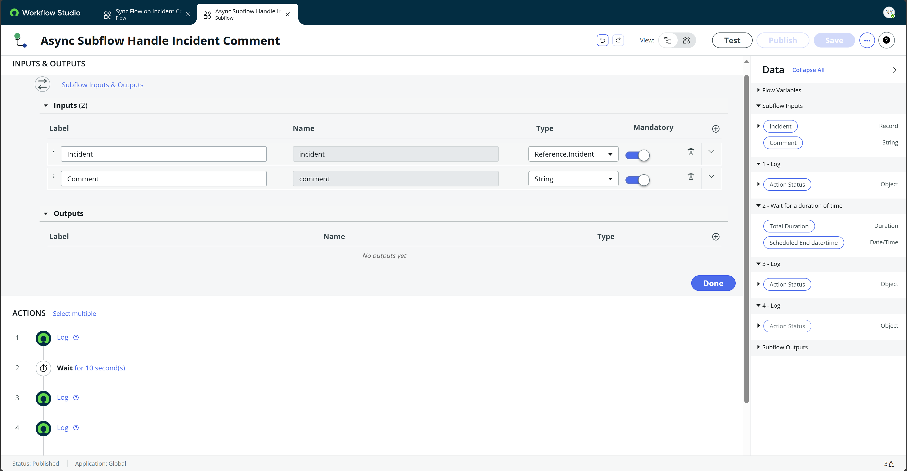 Next, we log a timestamp for when the Subflow begins processing. Then we add a 10-second Wait (you can increase this if you want, to allow yourself time to enter multiple Comments while the Subflow waits to execute during your testing). Finally, we log out the Comment from the Subflow Input. We can also add another log step where we repeat the script we used to retrieve the most recent Comment from the Incident to see if it differs from the Comment we received as a Subflow Input.