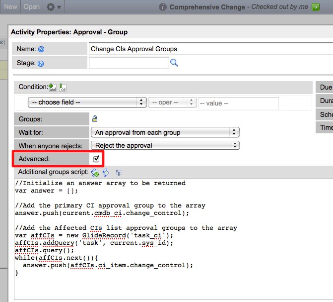 The ServiceNow Graphical Workflow mechanism also allows you be even more complex in the selection of approvals for your change requests. You can use script with GlideRecord queries to return any users or groups you want to have approve. The one thing to keep in mind with these scripts is that you need to return group records if your workflow activity is a Group Approval type and user records if your workflow activity is a User Approval type.
