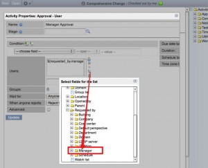 Another common method is to drill into the change request itself and pull the approvers from a field on the change. This method is commonly used when you want to have something like a manager approval for the person requesting the change (as shown below) or maybe when you want to have the assignment group on the change request approve.