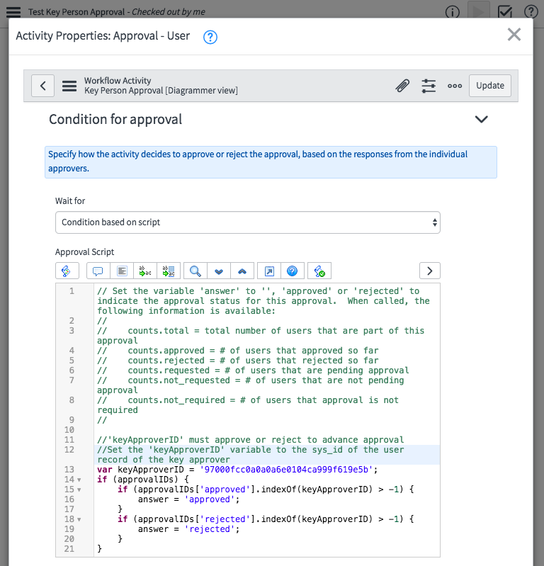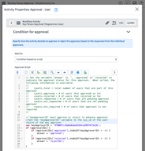 This script should be placed in the ‘Approval Script’ field in a ‘Approval – User’ workflow activity. The ‘Approval Script’ field displays when the ‘Wait for’ field is set to ‘Condition based on script’ as shown in the following screenshot.