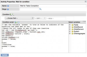 A common Graphical Workflow requirement in ServiceNow is to tell the workflow to wait for some trigger before continuing. The ‘Wait For condition’ activity is available out-of-box and is very simple to configure. Usually when working with Service Requests or Change Requests I am asked how you can set up the workflow to wait for completion of all associated tasks before closing the Request Item or Change Request ticket. This can be easily accomplished by using a script in your ‘Wait For condition’ activity to query for any associated tasks that are still marked as ‘Active’. If the task is marked as ‘Active’ then it hasn’t been closed yet and the workflow should wait for that closure. Here are some sample scripts that I’ve used before to wait for task completion on both Request Items and Change Requests.
