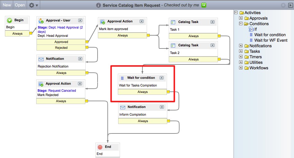 Good question. The wiki documentation, while technically correct, is also incomplete. The ‘Wait for’ condition is evaluated whenever the workflow context is re-evaluated. This happens on any update of the ‘current’ record, but it can also be invoked at other times from a script. There is an out-of-box business rule named ‘SNC – Run parent workflows’ that checks each record when it is de-activated and then triggers the evaluation of workflow contexts for any parent record. That’s why this solution works. Catalog tasks and Change tasks are linked to a parent record and they trigger the parent workflow context when they’re de-activated.