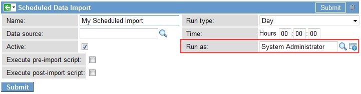 With a scheduled import however, that same assumption isn’t correct. Generally you would like to have those actions attributed to system behavior rather than the person who set up the scheduled import. Enter the ‘Run as’ field on the ‘Scheduled Import’ table.