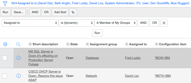The ServiceNow wiki does a decent job of explaining the basic concept and usage of dynamic filters. There are 1000’s of scenarios where users of the system need to query for information, display a list of data, generate a report, or values from a reference field based on a specific, logical filter criteria. There are many examples of this…my Group’s work, my approvals, records assigned to other members of my groups, etc. These types of scenarios, though simple on the surface, actually require sometimes very complex code to query for and return the correct data. ServiceNow has always allowed you to do this, of course, but the approach (asking a typical end-user to remember and correctly populate a specific query string with a function call directly in the filter) really isn’t one that works well — even if that user happens to be an admin of the system. Those query strings generally look something like this and can be pasted directly into any filter criteria to return information…