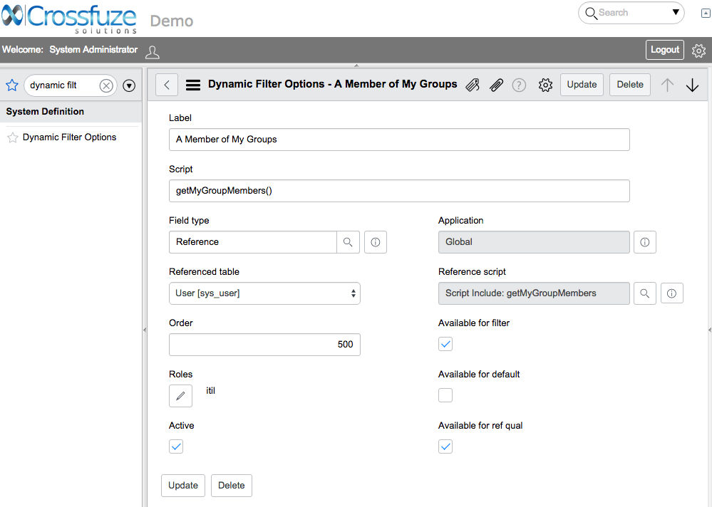 The on-demand function is great and allows you to easily return the data you want. From any place you can call scripts in the system. This is fantastic for business rules, workflow scripts, etc. but the average user running a report or filtering a list is not going to know (nor should they need to know) the exact syntax and function name to call. This is where Dynamic Filters come in! We can wrap that script call in a friendly label that displays in any filter anywhere in the system so that a normal human being can access it as well. Your dynamic filter for the script above should look just like I’ve shown in the screenshot below. You can create it by navigating to ‘System Definition -> Dynamic Filter Options’