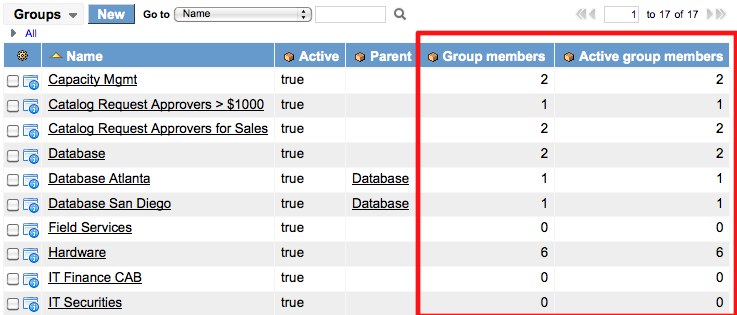 The biggest challenge in answering these questions is not around reporting on active users, but in reporting on groups that have no users. How do you bring up a report of records that don’t exist? When designing your Service-now implementation, its always important to understand the end reporting goals that correspond to each particular process. Reporting on groups with no members is a good example of a scenario where you’ll need to perform some sort of calculation and then capture that calculation somewhere where the data can be reported on.