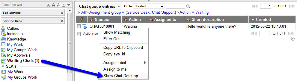Finally, you can add a context menu UI action for your list so that technicians can click into the module, right-click one of the entries, and open up the chat desktop directly from the list.