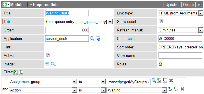 Once you’ve committed the ‘Module Counts’ update set you can create the module to display the number of waiting chat queue entries. I placed my module under the ‘Service Desk’ application and configured it as shown in the screenshot below…