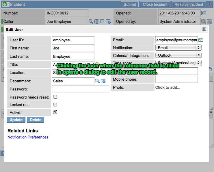 One problem I’ve seen a few times is the need to create a new record on the fly in order to populate it into a reference field. This problem recently came up for me with a client I’m working with so I decided to come up with a good solution. An example scenario would be a technician filling out an incident record for a user that doesn’t yet exist in the system. At first glance, the solution seems simple enough…simply navigate to the user form and create the new user, then create your incident record. While that can be done, it’s not always so simple. What if the technician has just spent several minutes filling out the incident and then realizes the caller doesn’t exist? The user would then have to navigate away from that incident record and lose all of the changes, or open an entirely new browser window to create the user and then return and populate the field.