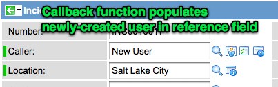 - Lastly, the callback function (the ‘setUserField’ function) gets called after the dialog is submitted and populates the reference field with the newly-added or edited record.