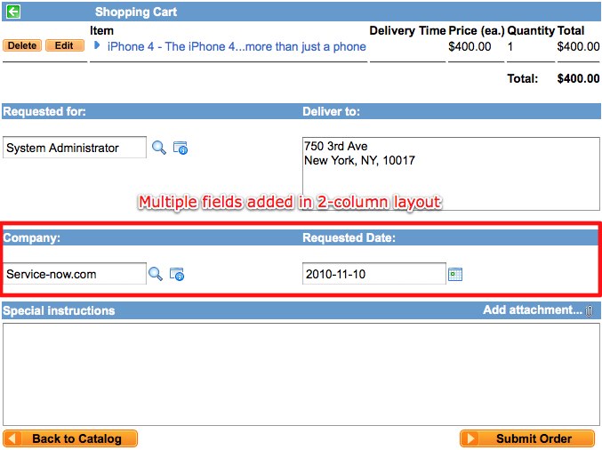 This article is an extension of an idea presented on the ServiceNow wiki that shows one way to approach this problem. The solution described here overcomes some of the problems with the wiki solution and gives a little bit more detail about how the solution works so that it’s easier for you to customize on your own. I’ll also include some formatting examples and show how you can add more than one additional field to the checkout screen.