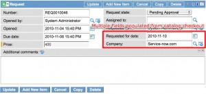 addLoadEvent(hideCheckoutFields); function hideCheckoutFields(){ //Check to make sure we are on the checkout page if($('sc_cart.do')){ try{ //Remove cart stuff here... } catch(e){ //alert('Error'); }; } }I have used this technique to add an approver field to the check out page. I use the value entered to populate a “Department Approver” field on the sc_request record. (I am using the ‘simple’ method of setting a single value on the request rather than the more complex method you describe here for populating multiple fields.