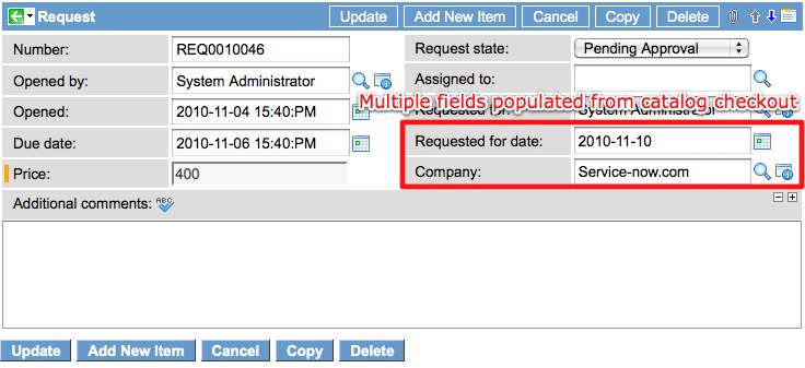 If you’ve done everything correctly you should be able to order a catalog item, view and populate your new fields on the checkout form, and see those fields populated on the Request record as shown here…