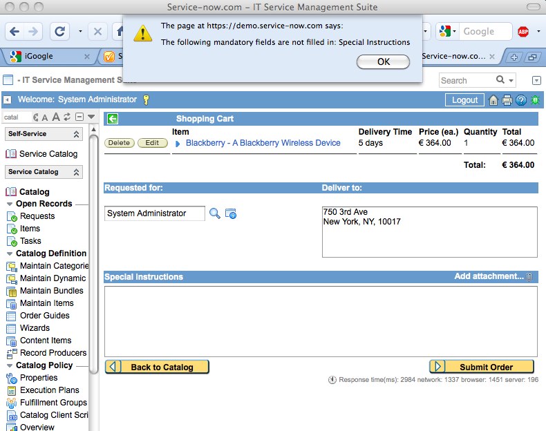 If you’ve used the two-step catalog checkout before you’ve noticed the few fields on the final checkout screen. Users can provide information about the Requester and their location, along with some special instructions for the processing of the request. These fields are all optional however, so there’s no way to force a user to fill any of this information out. If you did need to force one or more of these fields to be mandatory, you could accomplish this by making a couple of modifications to the ‘servicecatalog_cart_template’ UI Macro.