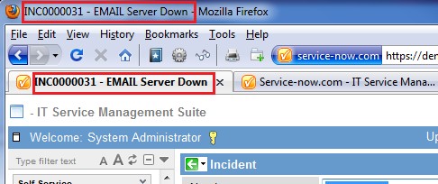 addLoadEvent(setTitle); function setTitle() { var title = top.document.title; try { var num = g_form.getValue('number'); var sd = g_form.getValue('short_description'); var nme = g_form.getValue('name'); if( (num != '') && (sd != '') ){ top.document.title = num + ' - ' + sd; restoreTitle(title); } else if( (typeof nme != "undefined") && (nme != 'undefined') ){ top.document.title = nme; restoreTitle(title); } } catch(e) { // Do nothing } } function restoreTitle(original_title) { // change the title back when we leave $j(window).unload(function() { top.document.title = original_title; }); }Nice! Thanks for sharing.