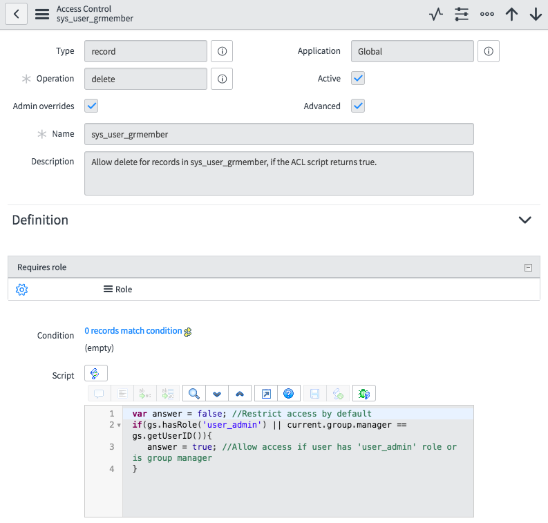 Opening up the create ACL is necessary for this configuration to work, but needs to be backed up by some additional security in the form of a ‘before’ business rule. The business rule performs a secondary check on insert/update of the group member record to ensure that the user is actually a group manager or has the ‘user_admin’ role. If not, it aborts the insert/update and alerts the user.Name: Restrict Changes to Group Managers