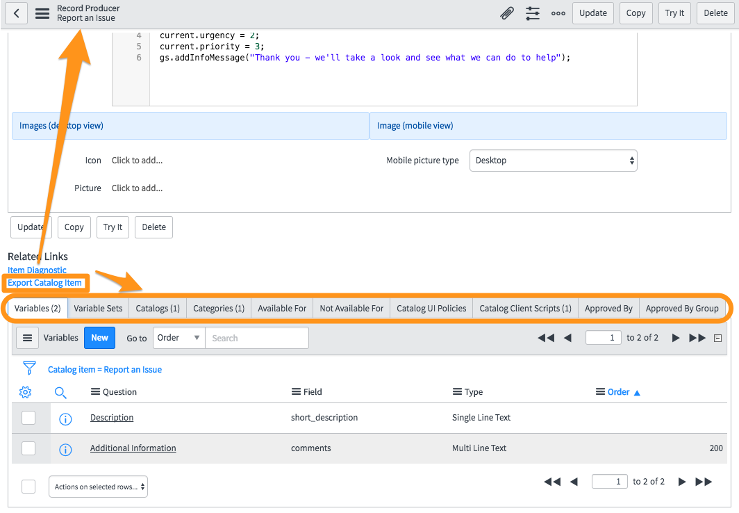 gs.log('** Exporting Catalog Item ' + sysid);//Name all the related lists
