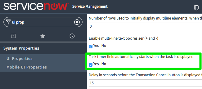 ServiceNow includes a simple property that allows you to specify whether the time worked timer should be started or paused when a task form loads. This property might meet the needs of some customers, but lacks the needed flexibility for most people using the time worked field. The property name is ‘glide.ui.timer.started’ and can be accessed under the ‘UI Properties’ module as shown here…