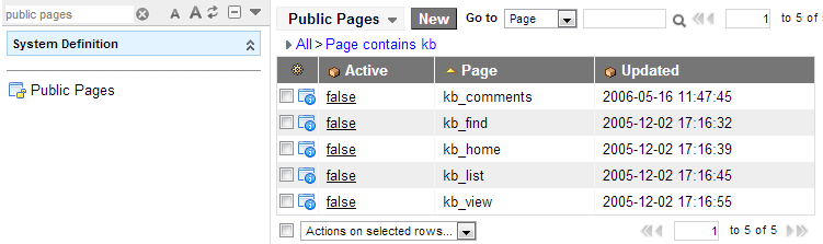 The ‘Public Pages’ table shows every page in the system that is available to unauthenticated users. Not all of these records are active however. For the KB, you’re interested in the five public page records with a ‘Page’ value containing ‘kb_’. If you’re making your knowledge base public, I suggest making ALL FIVE of these records active. Here’s what they control.