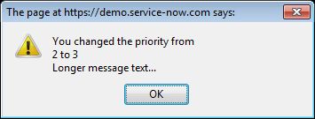 Standard JavaScript provides 3 different types of popup boxes: Alert box, Confirm box, and Prompt box. Since Service-now.com supports standard JavaScript, these popup boxes can be used anywhere in the application where client-side JavaScript is supported. They will most commonly be used in an 'onSubmit' client script or a UI action with the 'Client' checkbox checked.