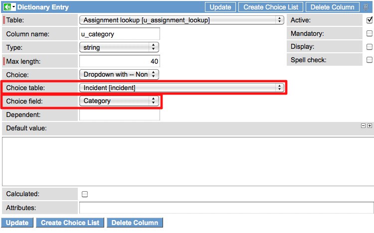In order to re-use choice list field values, the first thing you’ll need to do is set up a choice list field on a standard form with corresponding values. Once that’s complete, you can simply open up the dictionary entry (to re-use for a field) or the variable definition (to re-use for a variable) for your new field or variable and select the Choice table and Choice field values for the field that you want to pull the choice values from. Shown below are a couple of screenshots showing how you could set this up to re-use choices from the ‘Category’ field on the ‘Incident’ table…the first for a Choice field and the second for a ‘Select box’ catalog variable.