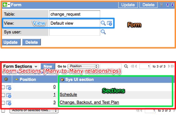 This post is written to hopefully eliminate some of the confusion with how forms, sections, and views relate and are stored in Service-now. I’m not going to go into any of the standard personalization details because those are all outlined in the wiki. Below is an outline of the table structure, relationships, and usage of forms, form sections, and views.