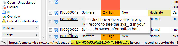 Since the sys_id of a record is always part of the URL linking to that record, you can see the sys_id in the information bar of your browser simply by hovering over a link to the record.