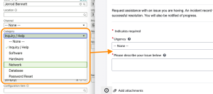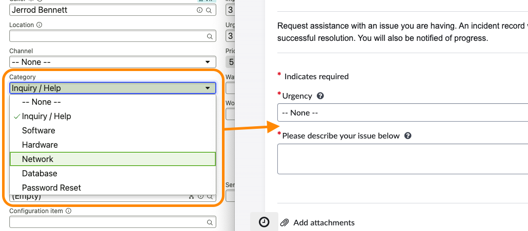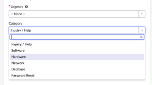 - Now when we navigate back to the form in the Service Portal, we can see that there is a new Category field on the form, and it already has Choice values that exactly match the Incident Category selections. Now if you change the available Choices for the Incident Category field, the Variable drop-down values will automatically reflect those changes without have to repeat the configuration on the Variable record.