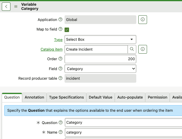 - To get these values onto the “Create Incident” Record Producer Form, create a new Select Box Variable to hold the values that need to be displayed.