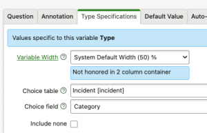 - Next, instead of creating mirror Choice options in the Question Choices Related List, navigate to the “Type Specifications” section on the Variable form. Enter the following values and save the variable: